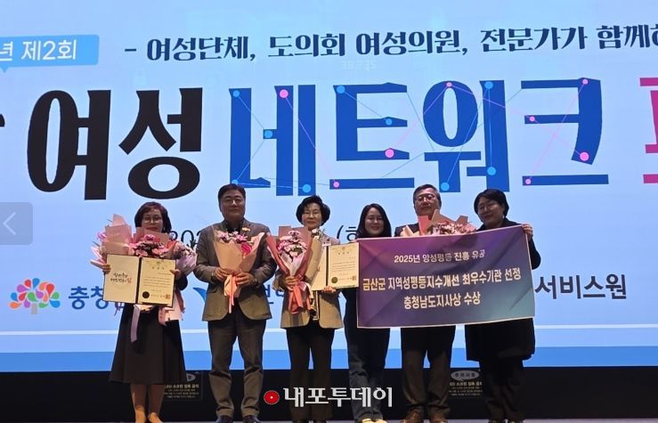 (내포투데이) 금산군은 지난 16일 충남 보령시 보령머드테마파크에서 열린 충남 여성 네트워크 포럼에서 지역성평등지수 개선 및 성별영향평가 실적을 인정받아 양성평등 진흥 분야 최우수기관 표창을 받았다.