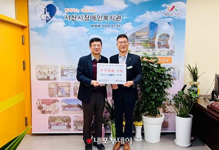 (내포투데이) 근로복지공단 서산지사가 2월 12일, 설 명절을 앞두고 서산시장애인복지관을 찾아 지역 장애인 가족들에게 조금이나마 도움이 되기를 바라는 뜻으로 온누리상품권 30만 원을 전달했다.