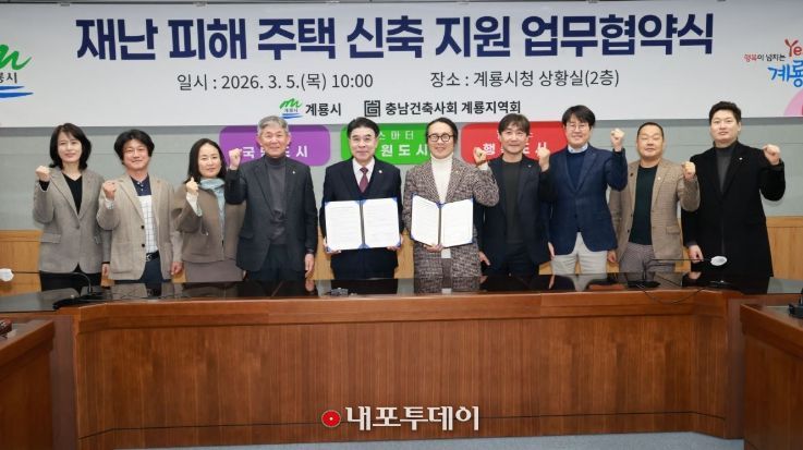 (내포투데이) 충남 계룡시는 5일 시청 상황실에서 충남건축사회 계룡지역회(회장 류욱형)와 ‘재난 피해 주택 신축지원을 위한 업무협약’을 체결했다고 밝혔다.